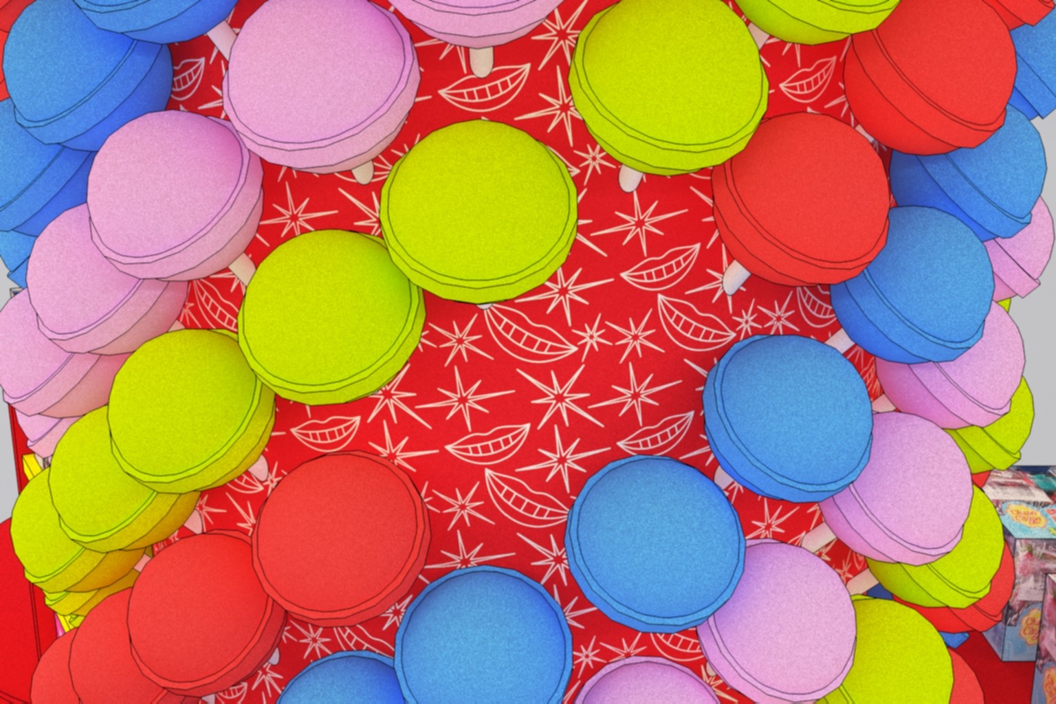 After 3 pitched concepts and multiple iterations, we landed on a carousel design. Incorporating a vertical slatted canopy overt the main stand to allow lighting to pour through. Milled banisters divide the three shelving units with emoji’s hanging in place. The central pillar is coated in a seamless pattern and covered in giant lollipops.